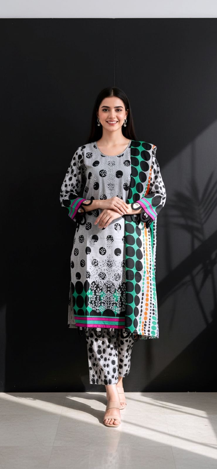 This premium handcrafted Lawn embroidered suit showcases meticulous handwork that highlights skilled artistry and timeless design. The fine detailing on the front adds dimension and elegance, making it suitable for semi-formal and formal occasions alike. The printed dupatta provides a graceful, lightweight finish that enhances the overall aesthetic. Soft, refined, and effortlessly stylish, this Pakistani eastern outfit is tailored to make a subtle yet powerful statement at any special gathering.